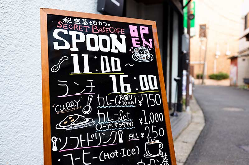 秘密基地カフェ SPOON(すぷーん)は、千葉 八街駅南口より徒歩1分。お昼はカレーやカフェメニュー。夜はおつまみ&各種アルコールをご提供しております。店名のとおり、一人でゆっくりしたい時に隠れられる「秘密基地」をイメージしており、誰にも邪魔されることない、あなただけの時間をお過ごしください。お店は貸切も可能。地元密着で地域の皆様から愛さるカフェを目指しております。